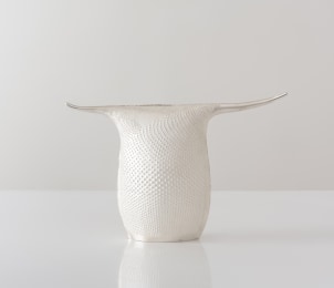 Yuki Ferdinandsen is a metalsmith artist living and working in Denmark, whose refined, minimalist works embody the aesthetics and traditional craftsmanship of her native Japan as distilled through a Danish lens. Working primarily in silver, she draws inspiration from nature, in particular the spirals of the Fibonacci sequence. Ferdinandsen’s work demonstrates a profound relationship to her material; the organic forms are articulated with rhythmic patterns created using the arare technique by which raised dots emerge through multiple strikes of a chasing hammer. Approximately twenty taps are required to produce each bead-like protrusion, and the meditative and repetitive nature of the process imbues her works with an ethereal quality.