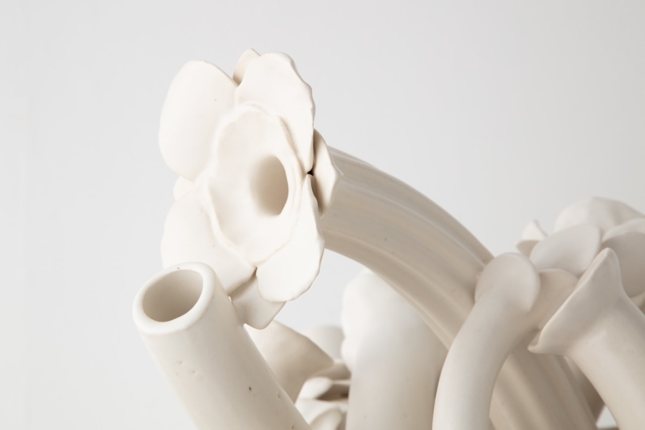Anat Shiftan (b. 1955, Israel) is a ceramic artist based in New York. She uses artistic and decorative motifs found throughout western art history—floral centerpieces and arranged still life vignettes—to explore her relationship to nature both as a human being and as an artist. In her own words, “When I make my floral piles, I explore the ambivalent condition of our relation with nature. As I attempt to look at nature I realize it is not there for me to view. Nature as an authentic, unpredictable, and uninterrupted phenomenon is not present in our world. Our ‘nature’ is stylized and cultured. Further, nature as a cultural concept is placed in contrast to the mechanized world, yet nature is in fact mechanical and predictable … Nature embodies the texture of sexuality, life and death, of power and subversion, and is very similar to complex political and social phenomena.”