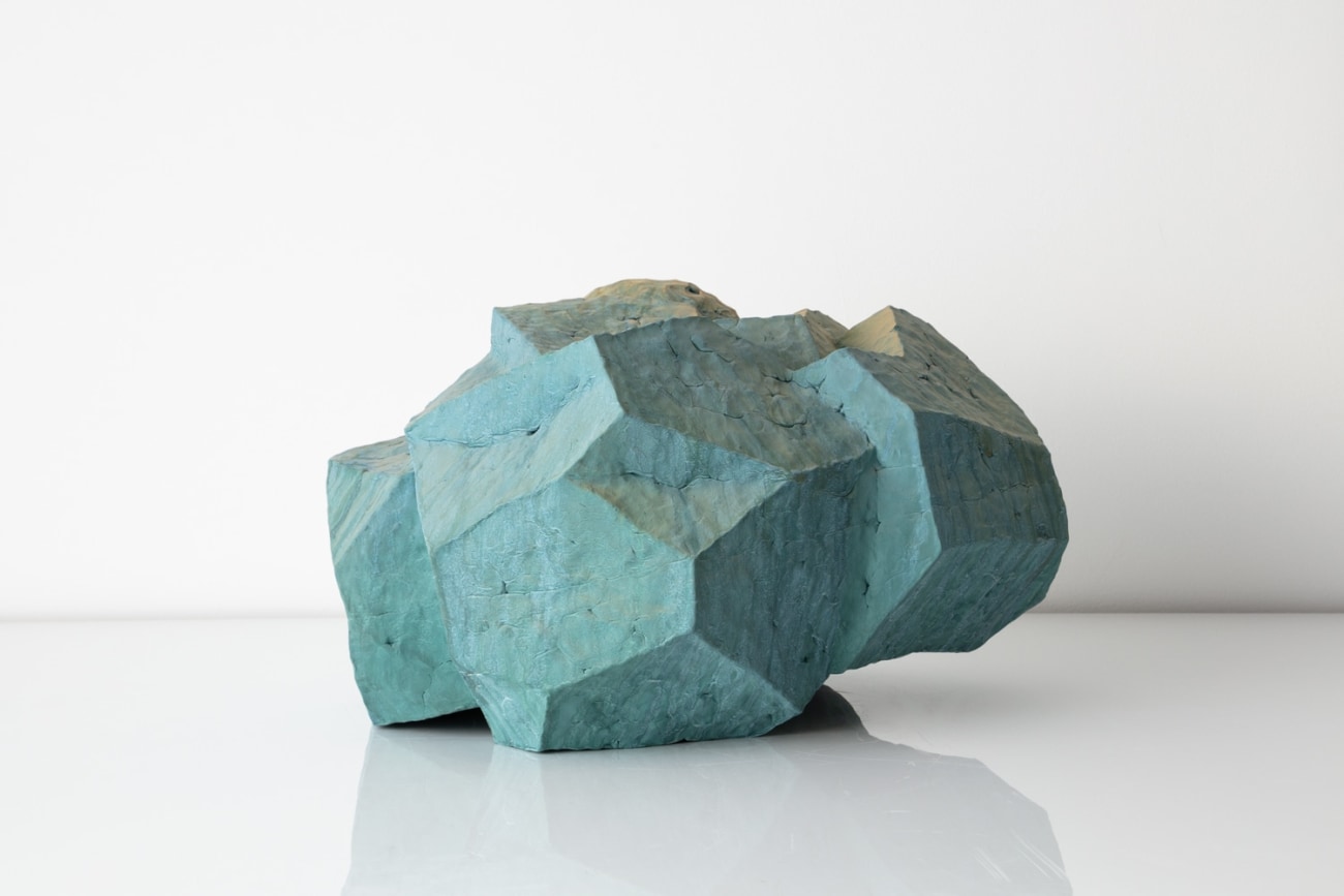 John Shea (b. 1989, United States) is a ceramic artist based in Little Rock, AR. His vibrantly painted sculptures contain an implicit duality that compounds virtual and material understandings of space and time. The contemporary, almost digital surface aesthetic is balanced by a physicality that might have been geologically formed eons ago. His process involves joining small, cut pieces of clay together, whose seams remain visible through lines and contour. The work’s color palette is often drawn from A Dictionary of Color Combinations by Japanese painter Sanzo Wada, a book that first appeared in 1932 as part of the development of Japan’s avant-garde and which includes numerous color combinations from raspberry and yellow-orange to dusty green and bluish-purple. After firing, Shea sprays each work with enamel oil paints rather than applying a traditional glaze, enhancing the luminescent qualities of his surfaces, which appear as though a colored light were shining on them; the radiant aura is intended to push the viewer’s sense of perception and expected experiences.